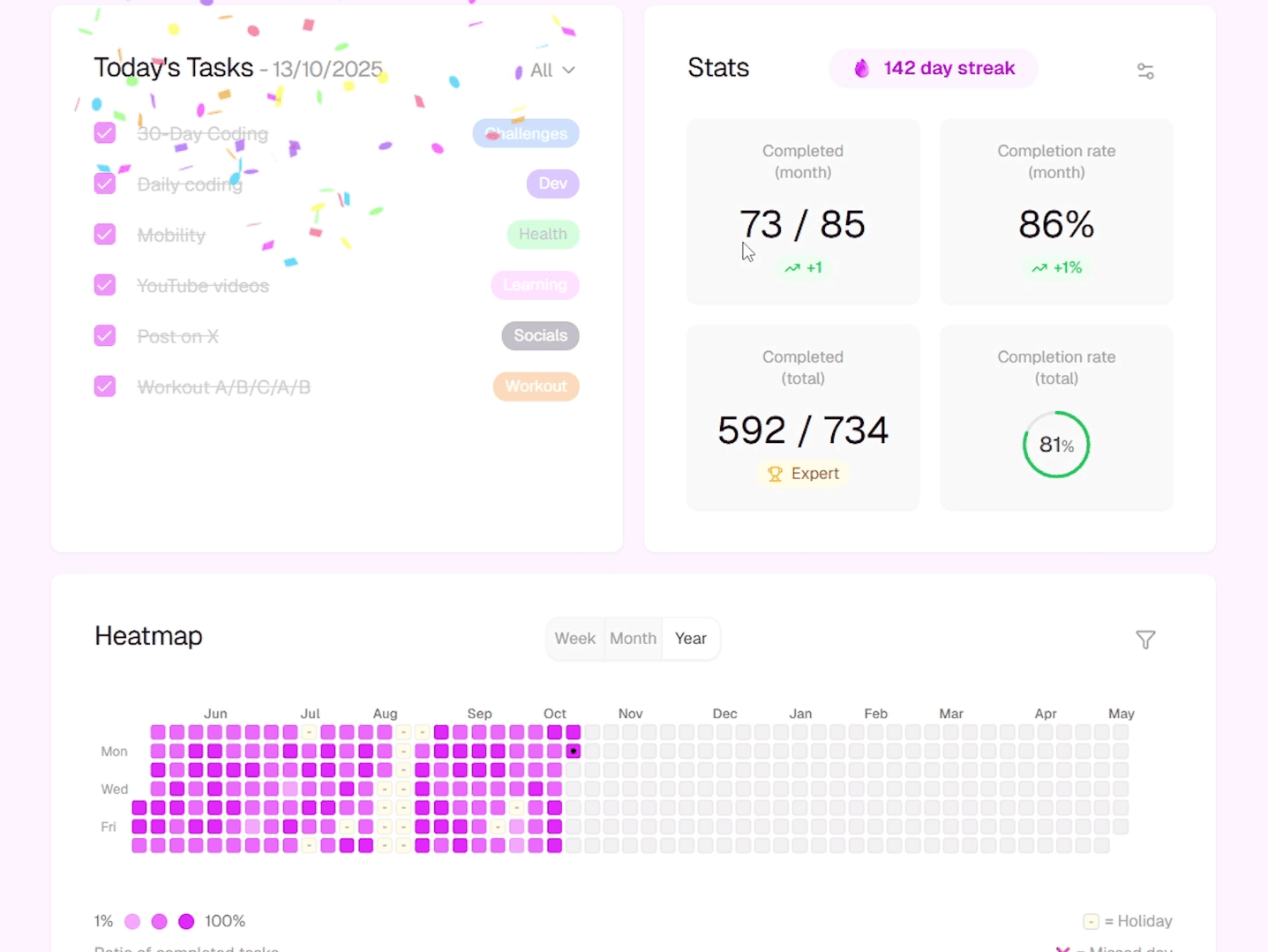 Heatmap, streak, stats, insights... All the visual feedback you need. The heatmap also lets you edit the completion of any task, anytime!